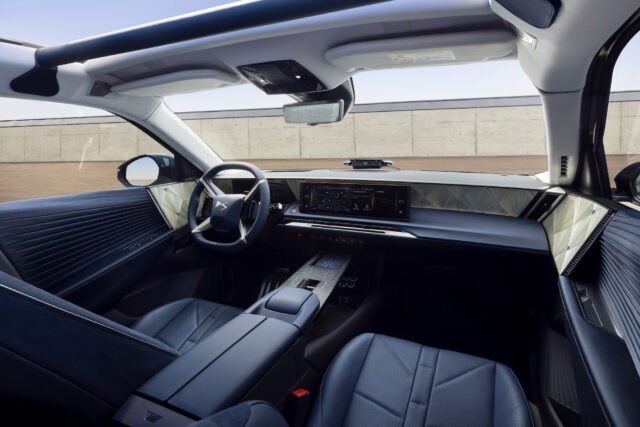 Der Innenraum des Fahrzeugs wurde ebenfalls neu gestaltet, mit luxuriöseren Materialien gegenüber der Serienversion, darunter Stroh-Maserung für die Armaturen und die Türverkleidung, Satin für die zentrale Konsole und ein exklusives blauer Farbton für das Lederpolster, das speziell für diese Präsidenten-Requisite ausgesucht wurde.